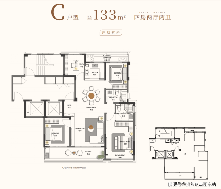 另外一款建面约133㎡户型, 典型的四叶草户型,动静分区,空间过道浪费少。