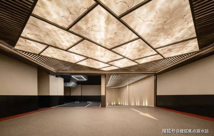 地下车库,坡道地面是无震止滑耐磨地坪,铝板打造的星空顶