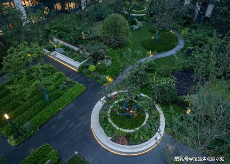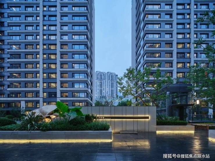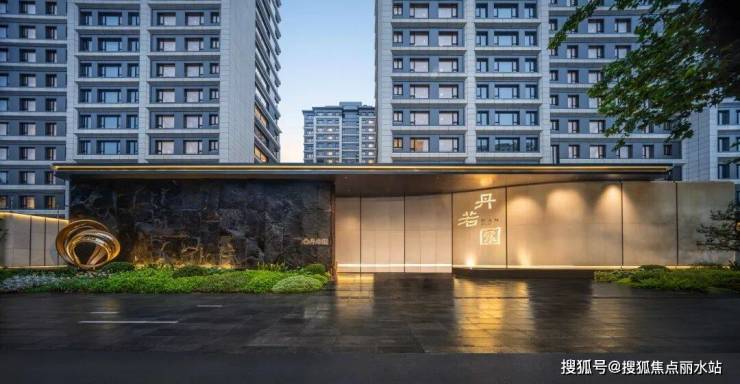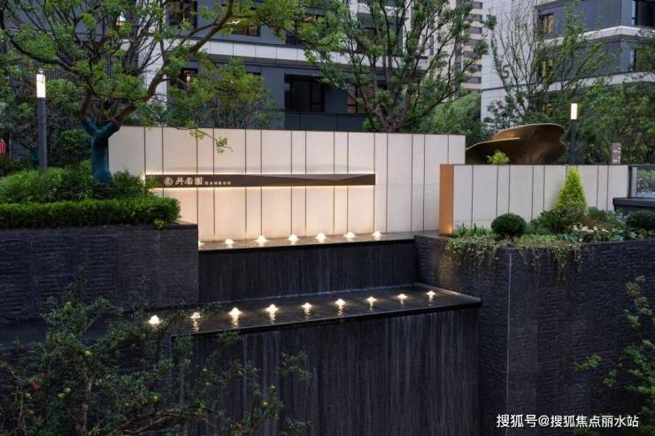 下沉式庭院高差5.8米,做了叠水水景,搭配印有丹若园字样的景墙,氛围感拉满