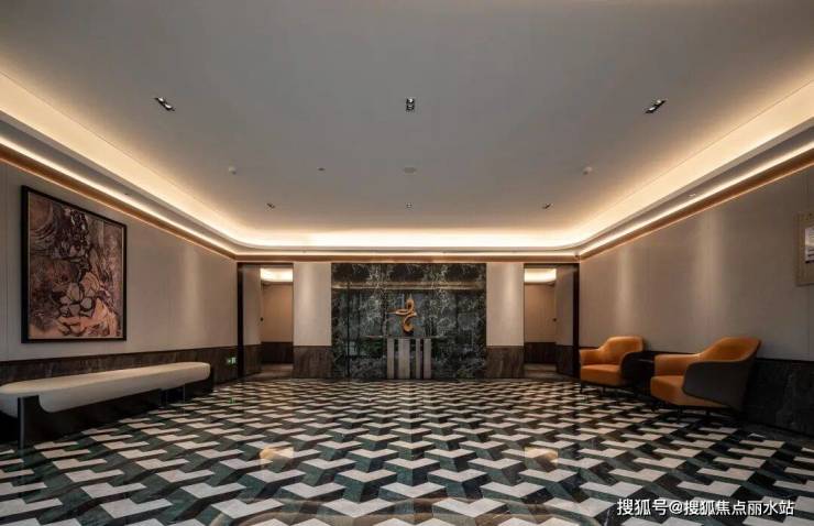 精装入户大堂,背景是墨绿色岩板,地面的石材拼花也很有特色