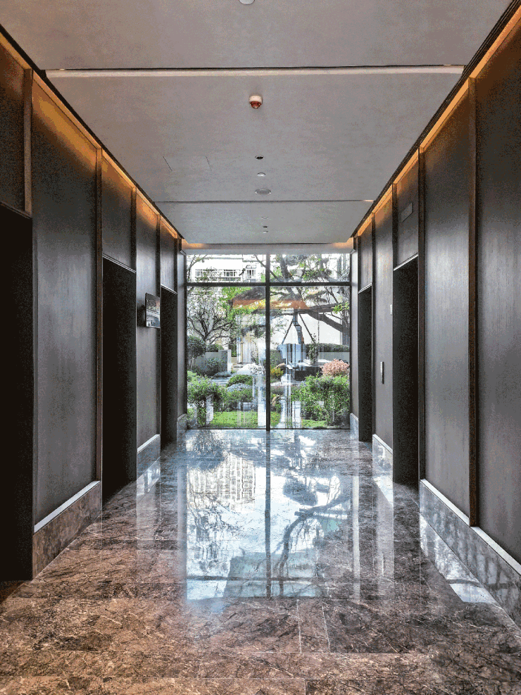 全明候梯厅,窗外风景一览无余;电梯内部,百达翡绿奢石整面上墙,这格调,这实力,明眼人都懂。
