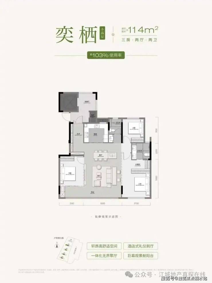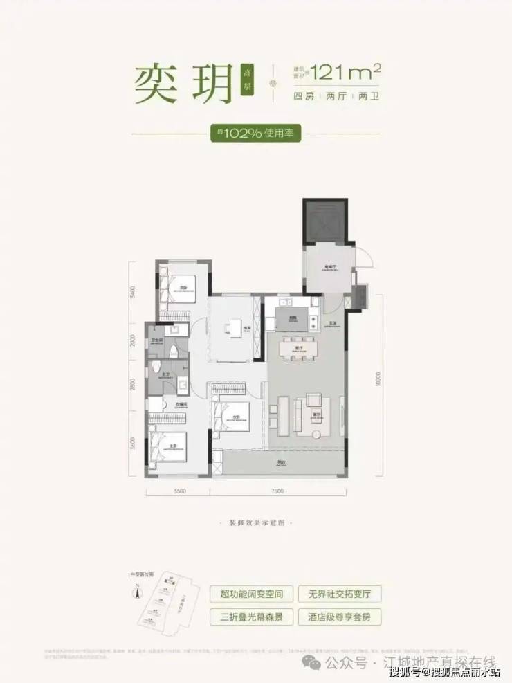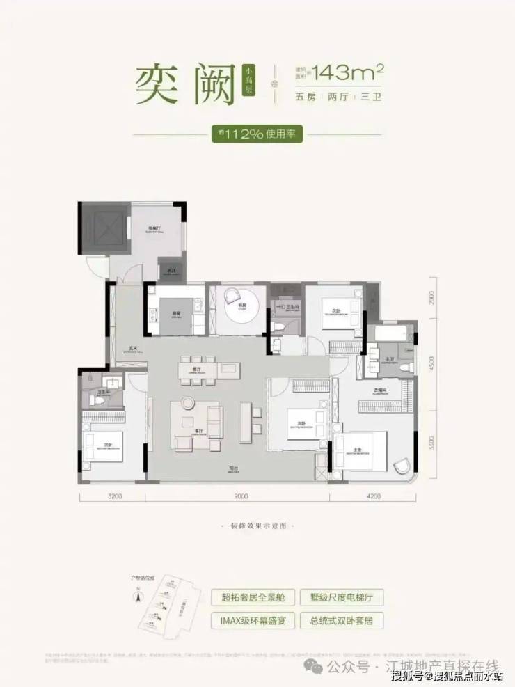 2、产品力升级:四代住宅设计,容积率低,最高得房率约112%,全2T2户配置,泛会所、园林景观均对标高端项目。