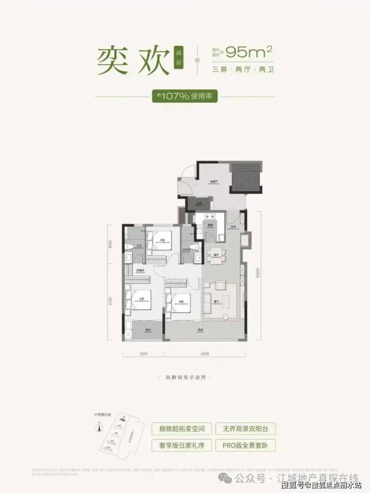 此次一期户型亮点多多,主推建面约95-140平户型,传闻户型类似金地大成乐府,全2T2户、专梯入户,得房率最高达112%,107平可做四房,实用性强。后续可以期待一下具体户型设计。