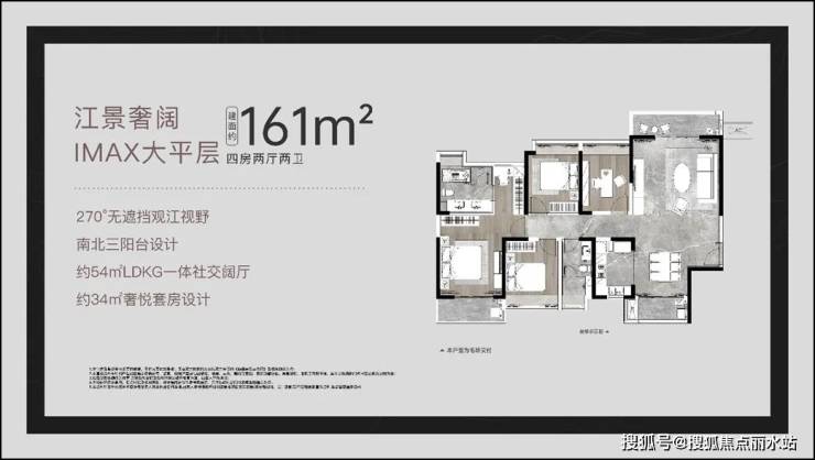 约161㎡江景奢阔IMAX大平层,270°无遮挡观江视野,南北三阳台设计,采用均好化的户型设计。