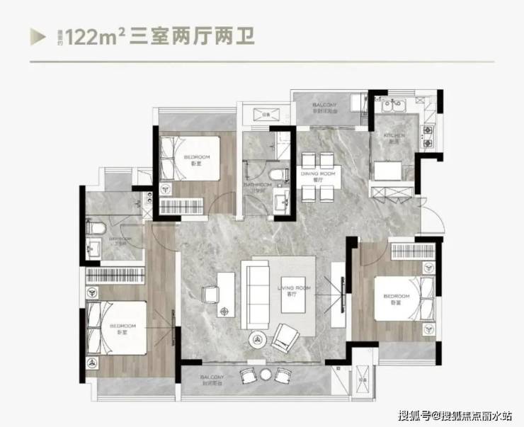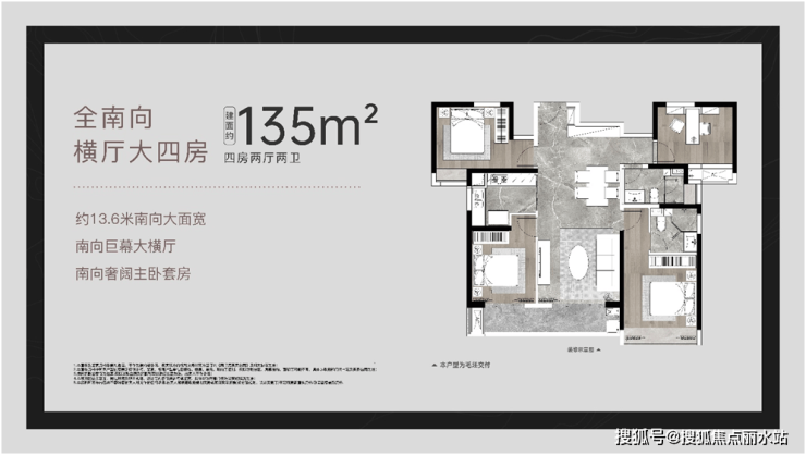 约135㎡全南向横厅大四房,约13.6米南向大面宽,南向主卧套房+双次卧+书房的组合搭配。