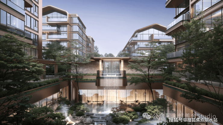 由外及内,从礼仪到日常,从都市风貌至迎宾雅致,匠心打造三重归家礼仪庭院。整体规划以围合式布局为核心,构筑“一心一环三庭五园七景十境”的空间序列。步入下沉式庭院,瀑布如丝如缕,连贯山水、台地、石景、森林与池塘,犹如一幅生动的立体水墨画卷,跃然于眼前。