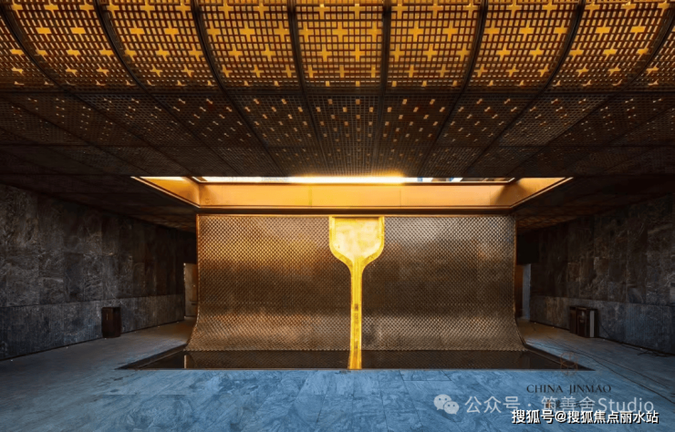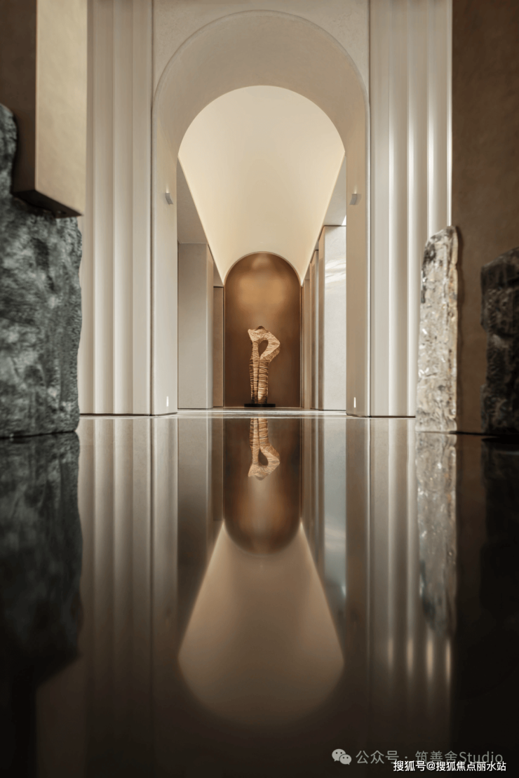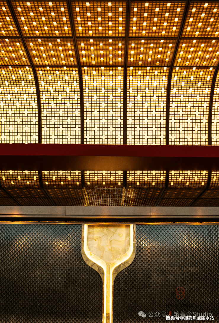 沉浸东方雅韵,唤醒古制新光——北龙湖首筑约300米地下环岛车马迎宾前厅,以沉香石材之奢华,融仿铜不锈钢之现代艺术,共绘墙面璀璨画卷,演绎当代东方礼制的极致新生。