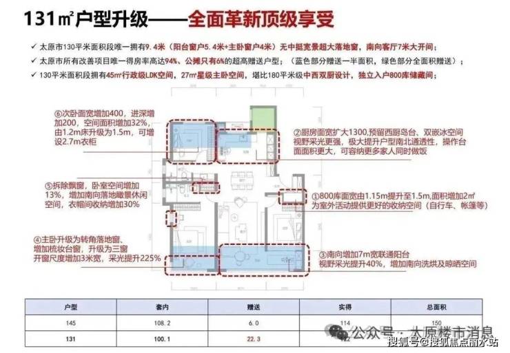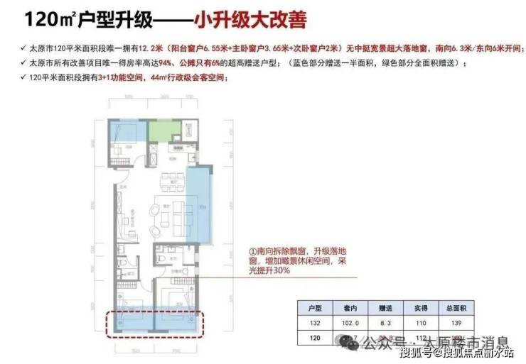 太原市所有改善项目唯一得房率高达94%、公摊只有6%的超高赠送户型;(蓝色部分赠送一半面积,绿色部分全面积赠送);