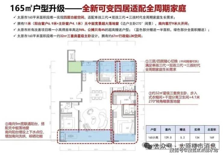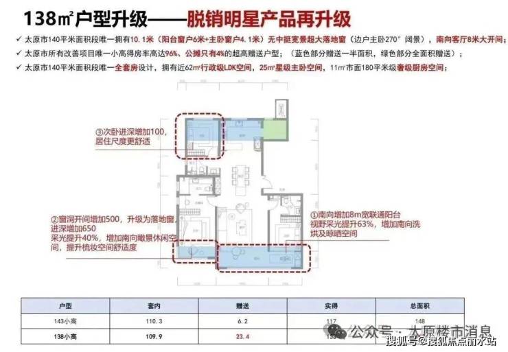 太原市所有改善项目唯一小高得房率高达96%、公摊只有4%的超高赠送户型;(蓝色部分赠送一半面积,绿色部分全面积赠送);