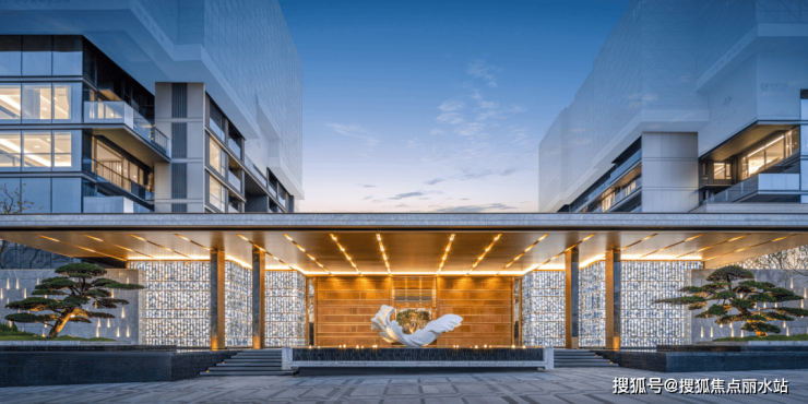 作为建筑礼制的重要表达,小区门庭采用凤翎咏归的高定大门,近70米酒店式门廊,尺度与气势兼具,属于业主的滨水度假生活也由此打开。