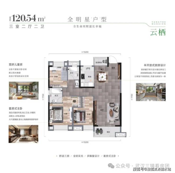 约125㎡【3房2厅2卫】南北双阳台,大尺度三房,超高赠送,高得房率