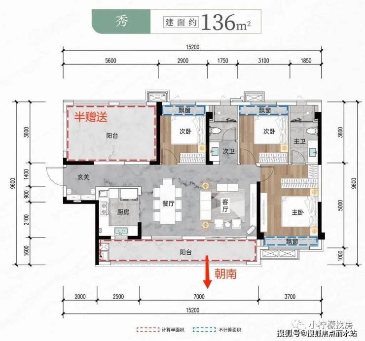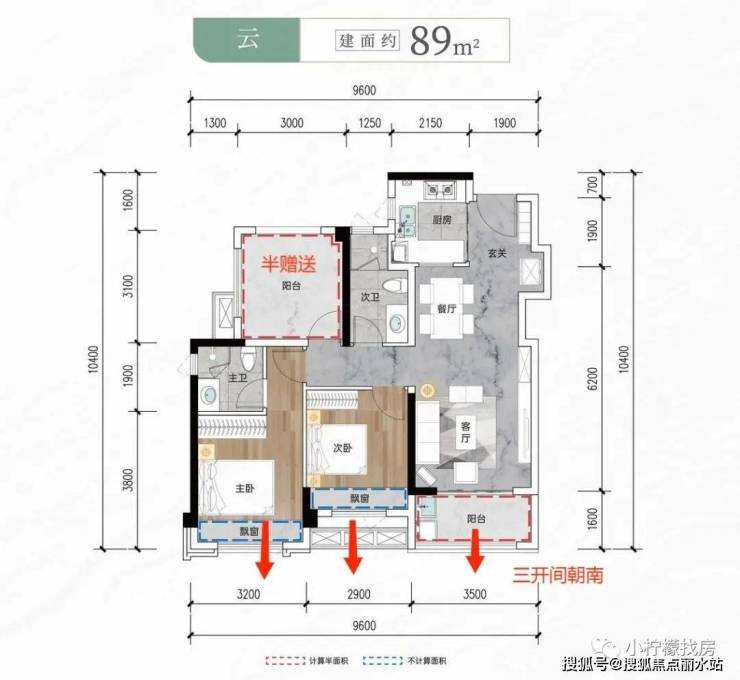我们再看看户型图,89平的小三房,做到了客厅、主卧以及一个次卧,三开间朝南,还有一个次卧是一个阳台的设计(精准交付时,这个阳台做成的是一个卧室),也就是做到了一个房间的半赠送。