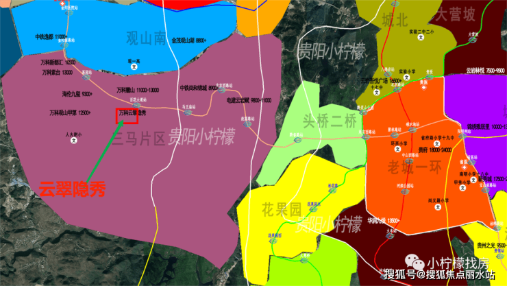 万科·云翠隐秀位于云岩三马片区比较居中的位置,北靠马王路和万科麓山,南临普天中央国际。看下图红色小方框处。