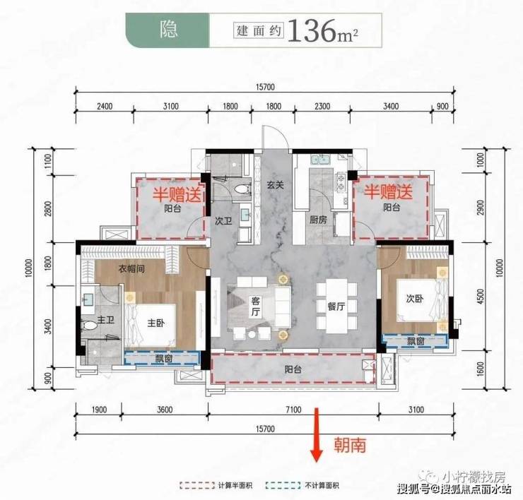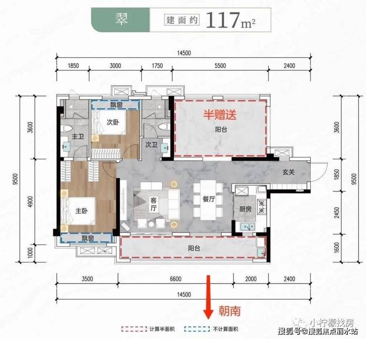 我们再看看这个117平的户型,一个接近20平米的大阳台,也是半赠送,客厅阳台长达8.6米,也是南向。