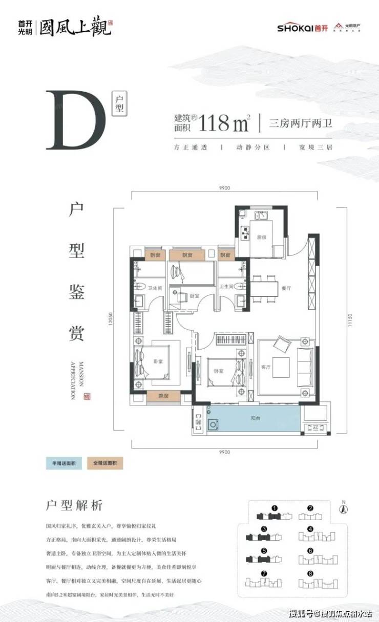 建面约118㎡户型,三房两厅两卫:该户型位于1、3号楼西边户和单元拼接户,2号楼两端边户。户型方正,三开间朝南,南北通透,动静分区,主卧带独立卫生间。南向带有大阳台,视野和采光较好。主卧南北贯通通透性较好,飘窗优化面积多,结构不错。
