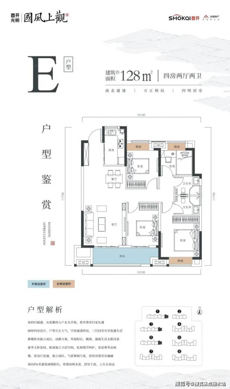 建面约128㎡户型,四房两厅两卫:该户型位于1、3号楼东边户,户型方正,南北通透,三开间朝南,动静分区。南向带有大阳台,视野和采光较好,主卧带独立卫生间。128平做到四房功能性还是比较强的。