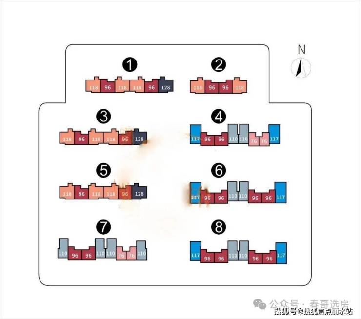 1、3号楼为21层、2个单元、2梯3户结构;2号楼为21层、1个单元,2梯4户结构,包含建面约96-128平房源。
