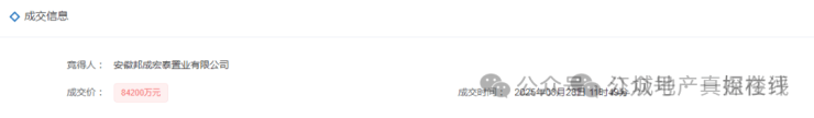 邦泰璟和就是2025年3月28日成交的P(2025)014号地块。该地块在竞价44轮后,被安徽邦成宏泰置业有限公司(四川房企邦泰集团)拍得,成交价约84200万元,溢价率约34.29%,成交楼面价约11455.8元/平。