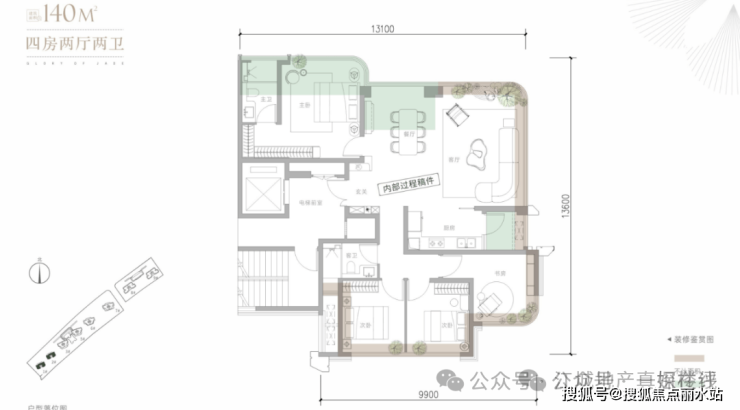 其中,2号楼中是建面约140平四房两厅两卫户型: