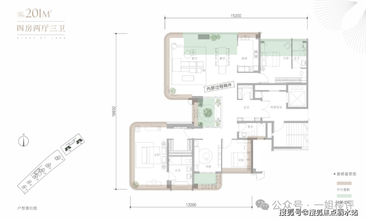 8号楼中则是建面约201平四房两厅三卫的大户型: