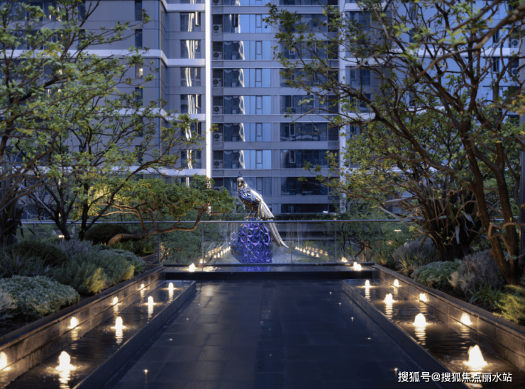 还有项目5、6号楼之间的二层连廊,原来采用的是基础造型花池设计,没有豪宅归家入户的仪式感,为此,开发商又重新设计,植入发光的“叶子”雕塑,实现了二层归家体验的质变!