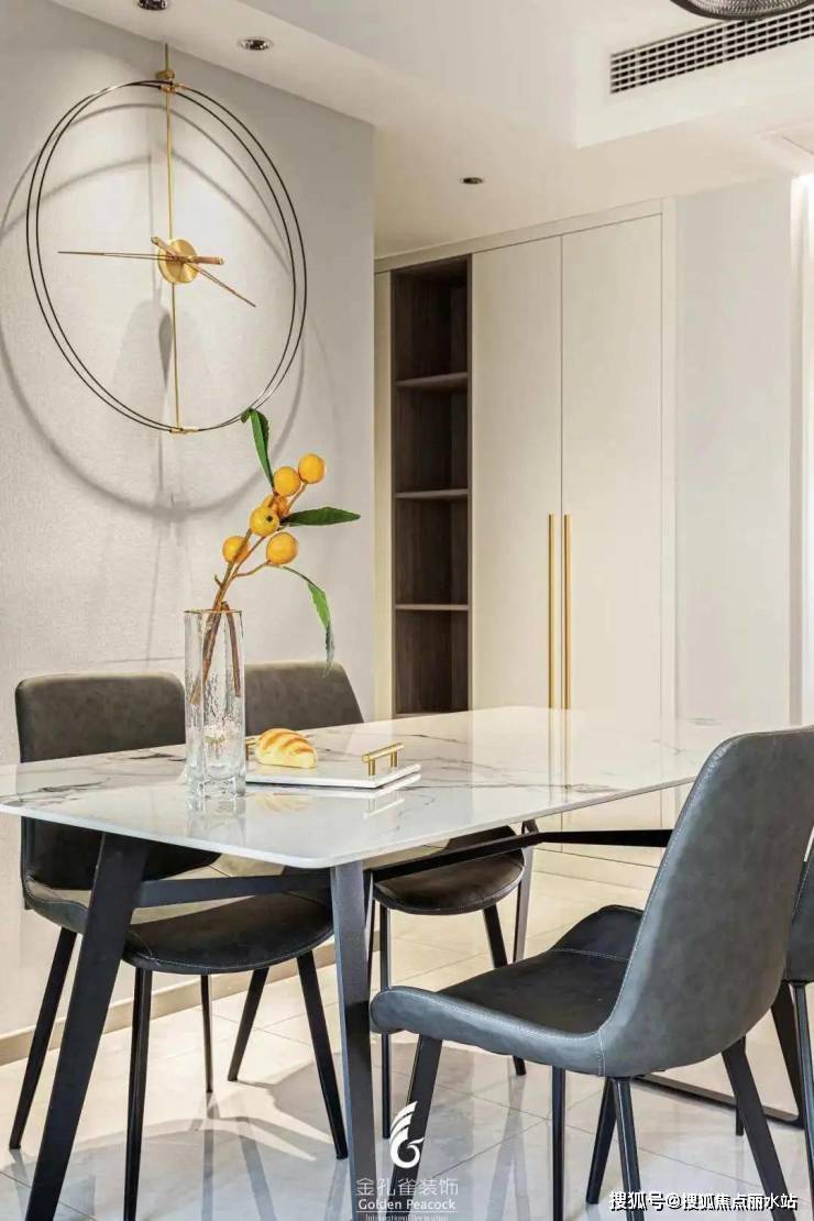 餐厅以爵士白的大理石餐桌为主,搭配深灰色餐椅,简约时尚。考虑到改造后空间的原因,舍弃了餐边柜设计,用走廊处的柜体补充了原本收纳上的不足。
