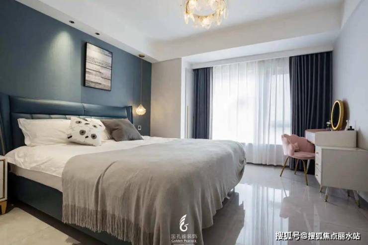 主卧和次卧室床头墙都采用深蓝色背景,布置同色系带皮艺靠背床,搭配洁净的灰白色床品,使得卧室空间显得安静舒适而优雅大气。