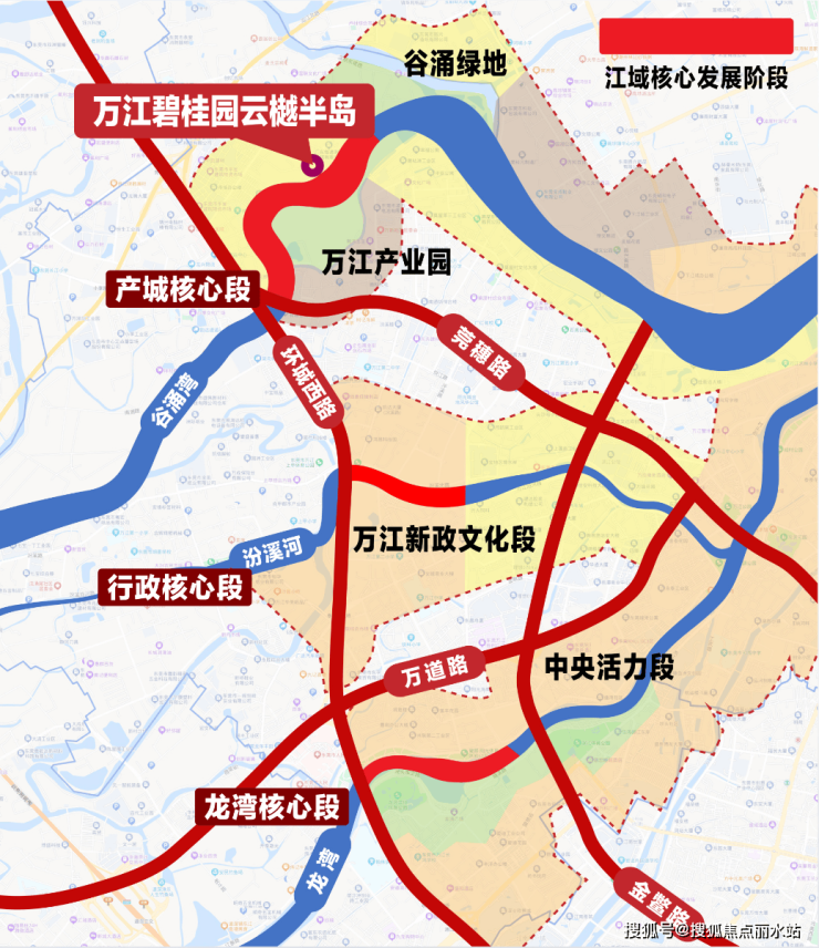 那么,我们还要看懂万江的江域规划,万江一脉三江,以三条江域为依托,划分三条核心发展段,分别是龙湾核心段、行政核心段以及产城核心段。