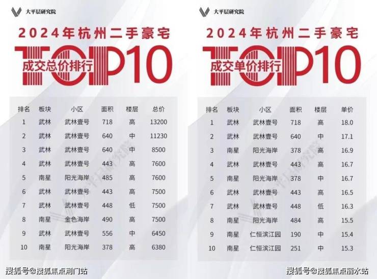 根据大平层研究院的数据,2024年杭州二手高层豪宅成交的单价和总价的TOP10中,滨江一家包揽,遥遥领先,没有竞品。