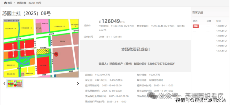 去年12月中旬土拍中,招商以总价约12.6亿竞得,成交楼面价约为27342元/㎡,溢价率2.02%。