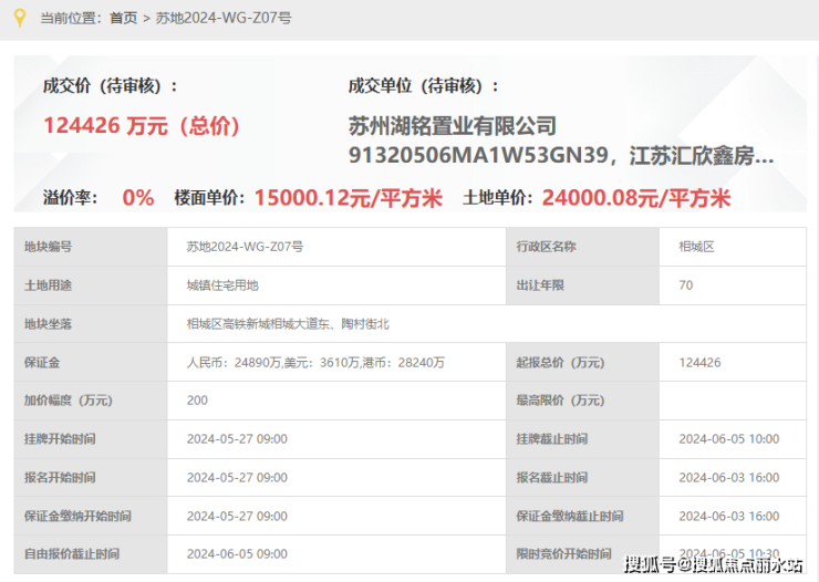 龙湖未来御湖境,即,苏地2024-WG-Z07号,位于相城区高铁新城相城大道东、陶村街北,是6月5日,龙湖以底价124426万元竞得,成交楼面价15000元/平。