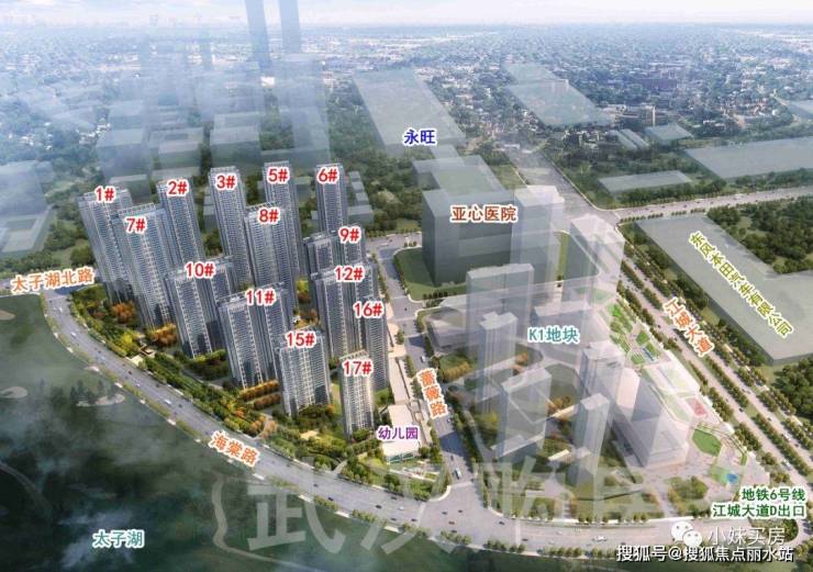 K1地块,东临江城大道,南临海棠路,西临蔷薇路,北临太子湖北路。按照发改局项目备案内容,项目基本按照备案文件进行,规划4栋34层高层住宅、2栋28层高层住宅、1栋1层开闭所、2栋2-3层独立商业、1栋43层单元式办公楼及裙楼商业、1栋32层开敞式办公楼及裙楼商业、1栋20层星级酒店及酒店配套商业、局部1层地下商业,3层整体地下车库。