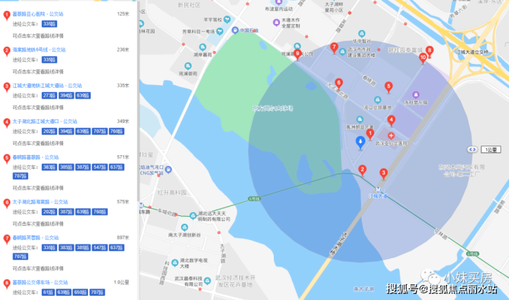 公交方面,图示的是禹洲朗廷元著的营销中心位置,周边600米范围内有4个公交站点,公交线路比较多,可以去汉阳核心、国博、经开万达、武昌站等方向。