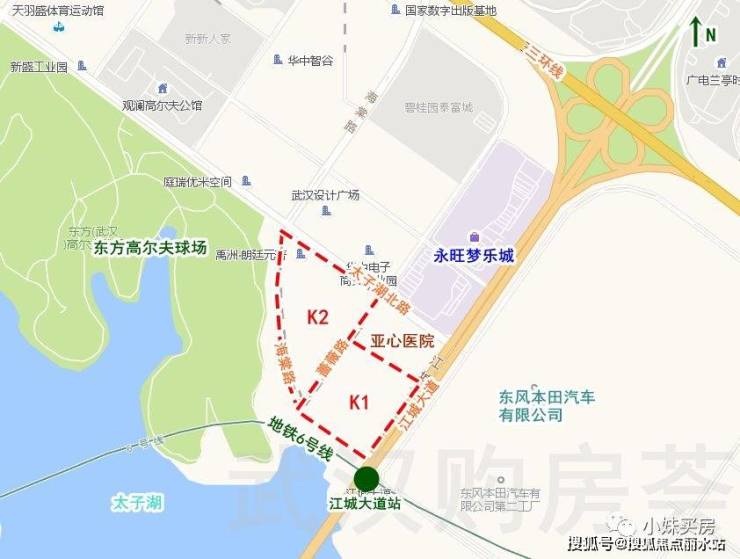 小区位上看,北临亚心南路,太子湖北路,亚心医院,经开永旺;南临海棠路,南太子湖;东临江城大道、东风汽车有限公司;西侧是海棠路,东方高尔夫球场,其中K1、K2地块中间是蔷薇路。