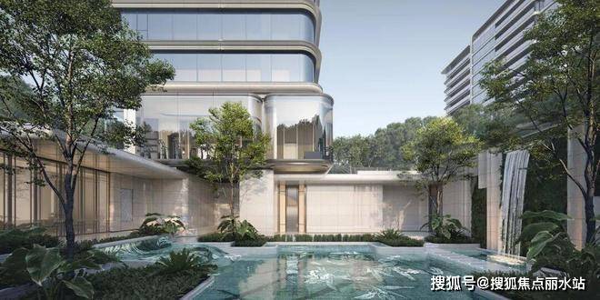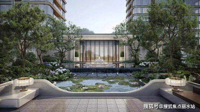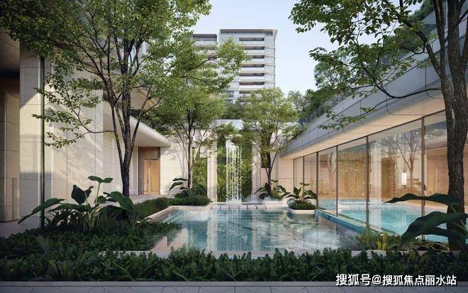 ②丰富的公区配置:下沉庭院、室内恒温泳池与嬉水池(两者通过可开合玻璃立面产生互动)、中轴水景花园会所、空中观景健身盒子。