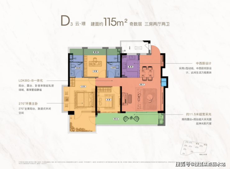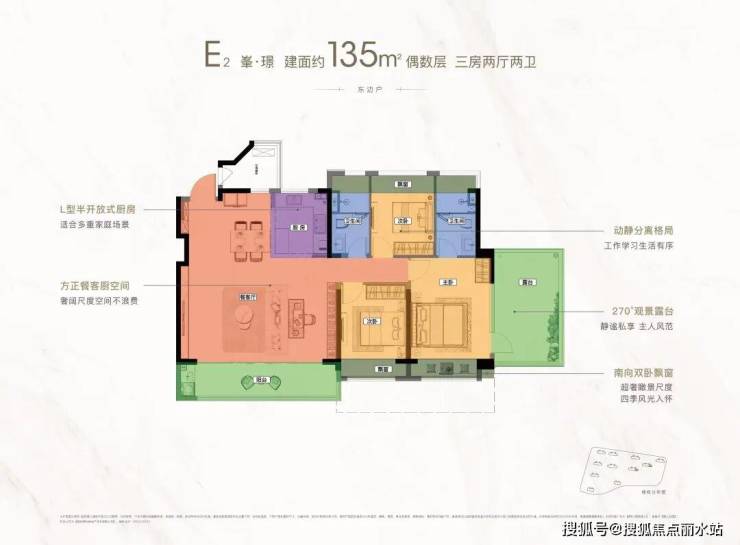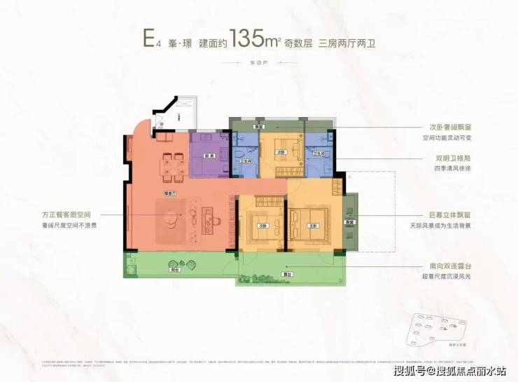 135平偶数层东边户同样是三开间朝南,全屋飘窗多赠送,不过露台在东侧,也是270°观景,视觉体验一样棒。