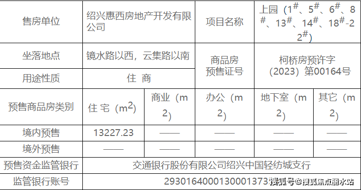近日,柯桥区人民政府网站公布了上园1#、5#、6#、8#、13#、14#、18#-22#的预售许可公告。