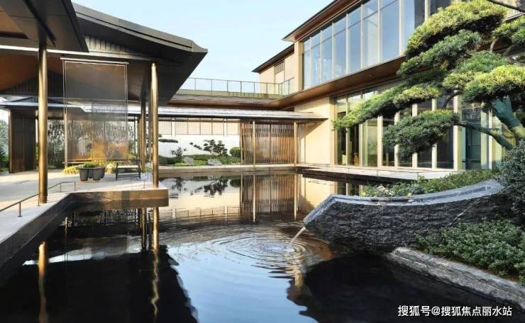 不止飞瀑,实际上在河印府的示范区中,水是贯穿其中的重要元素,从前场到过渡空间再到下沉庭院,或镜面、或溪涧、或叠水,通过不同的形式形成了概念上的「山环水绕」,也是寓意上的好彩头。