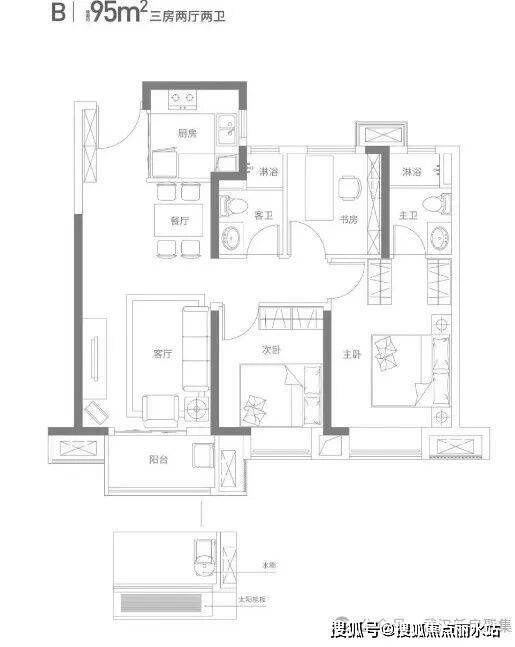 建面约95平 三房两厅两卫