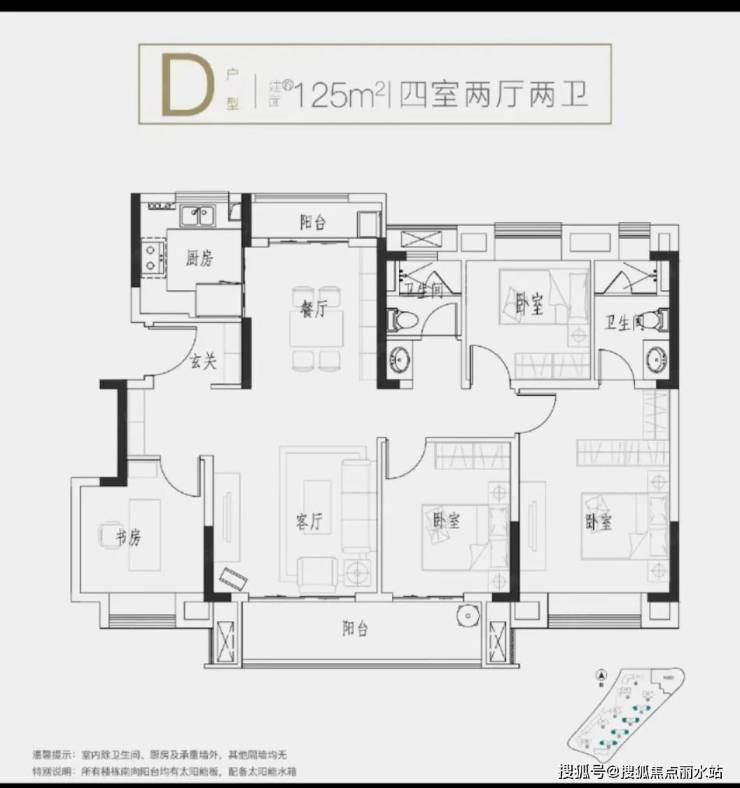 建面约125平 四房两厅两卫:边户,南北通透,四开间朝南,三面采光,主卧独立卫浴,南北双阳台且南向双联阳台。