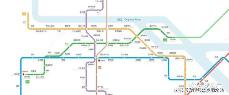 温州市轨道交通示意图(绿色线为地铁M3线,蓝色线为轻轨S1线)