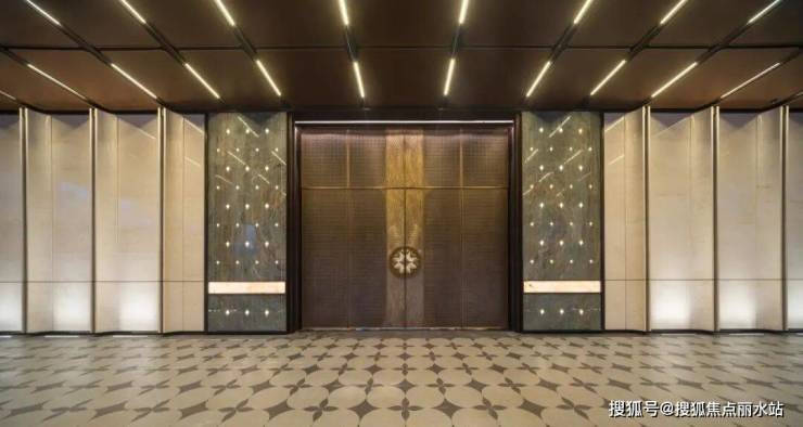 从一层乘梯至负一,电梯厅墙面用维纳多米黄石材雕刻天曜星芒,温润质感尽显精致;天花融入八芒同辉标识与开元寺钟楼灵感,搭配雪山银狐透光奢石,光线洒落如星光;地面水磨石嵌入天曜 logo,与天花呼应,踏出电梯即享世家仪式感。