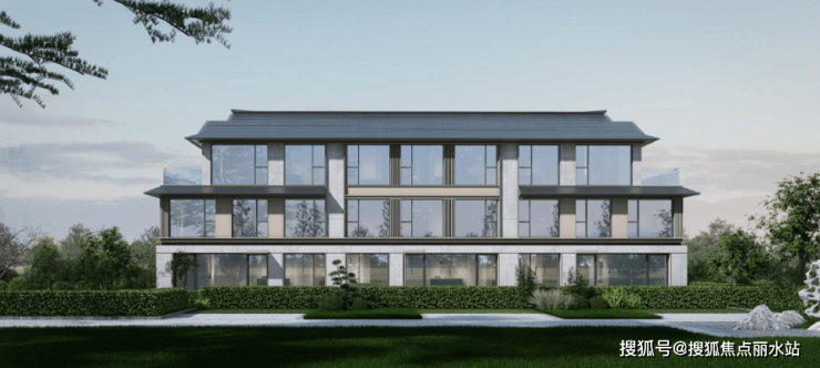 3F联效果图如下,简约新中式风格,外立面运用有石材等材质。