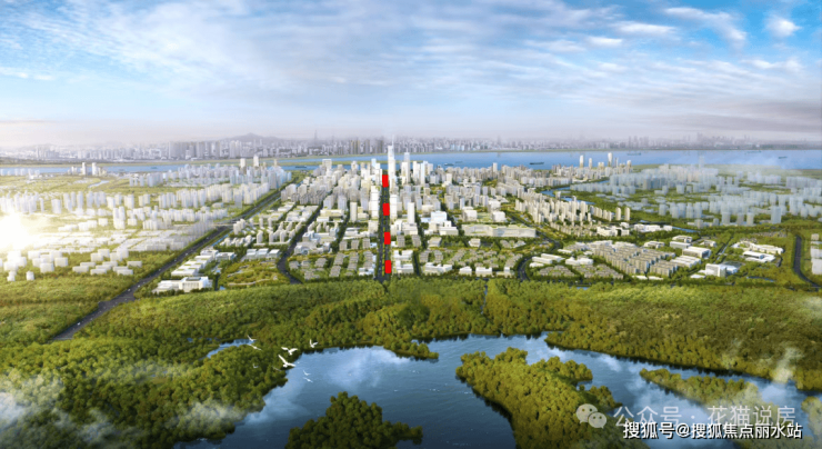 江北中心核心区域效果图,图中红线标注为定山大街位置,图源:南京江北新区