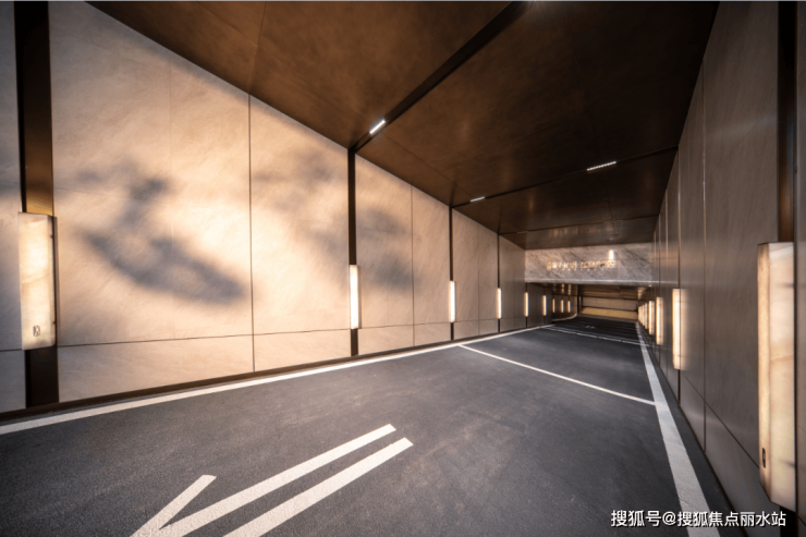 驾车驶入,地库温柔仪式感直接拉满:金刚砂加固化剂一体成型的地面,观感细腻柔和且行车无声,温润光线映照米色墙面,瞬间驱散一天疲惫;低饱和度导视系统静立指引,不突兀更显质感,每一处转角都藏着工整韵律。