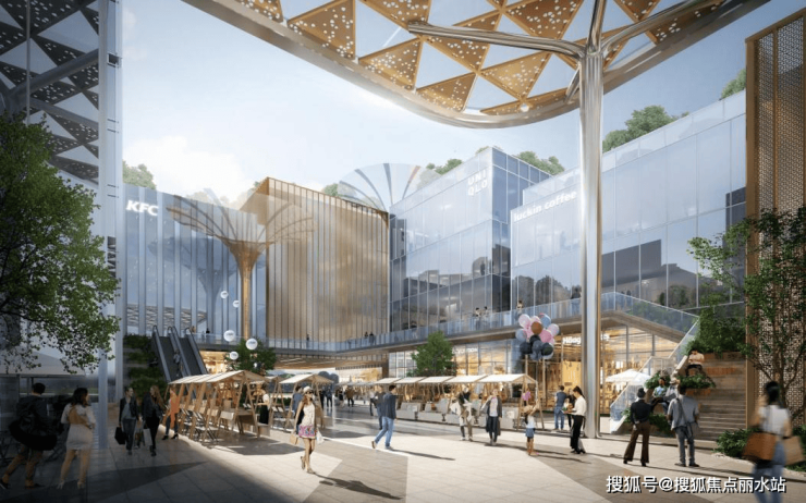 公建立面:以多元化的材质、尺度、错落进退,形成小体量的有机形态,在消解了矩形大体块压抑感的同时,也形成立面整体效果的均衡与统一,构建一个向上生长的绿色商业社区。
