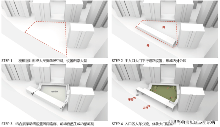 归家小院:利用消 防尽 端道路设置泳池等候休憩花园,满足家长等候的需求,也能为泳池提供后续放置水壶、毛巾等临时 需求的空间。