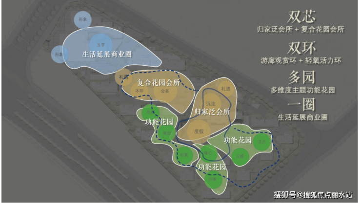 海上生花,奢隐雅居,融合现代对物质生活及艺术品味的追求,营造理想度假式人居环境。引入空间围合中心大花园的经典设计手法,通过形似项链的公园绿道将阳光泳池、风雨游廊、会客花园、阳光会客厅,六大全民主题架空等分散节点,有机链接,营造多层次景观空间,营造高浓度生活体验,增加了人与人,人与景交互,触手可及,相映成趣,方寸之地,自有千秋,目力所及,处处自然之韵。