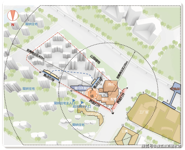 高层酒店及社区配套置于地块西北侧,对外顺应周边界面,打造城市形象;对内形成商业界面,凸显城市烟火气。