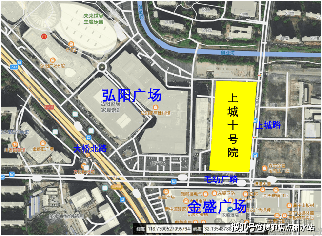 西边是弘阳广场和车流量最大的大桥北路,南边是金盛广场和毛纺厂路,东边是上城路,北边是一条小河和旭日上城二期;